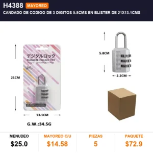 Candado de codigo de 3 digitos 5.8cms en blister de 21x13.1cms cantidad