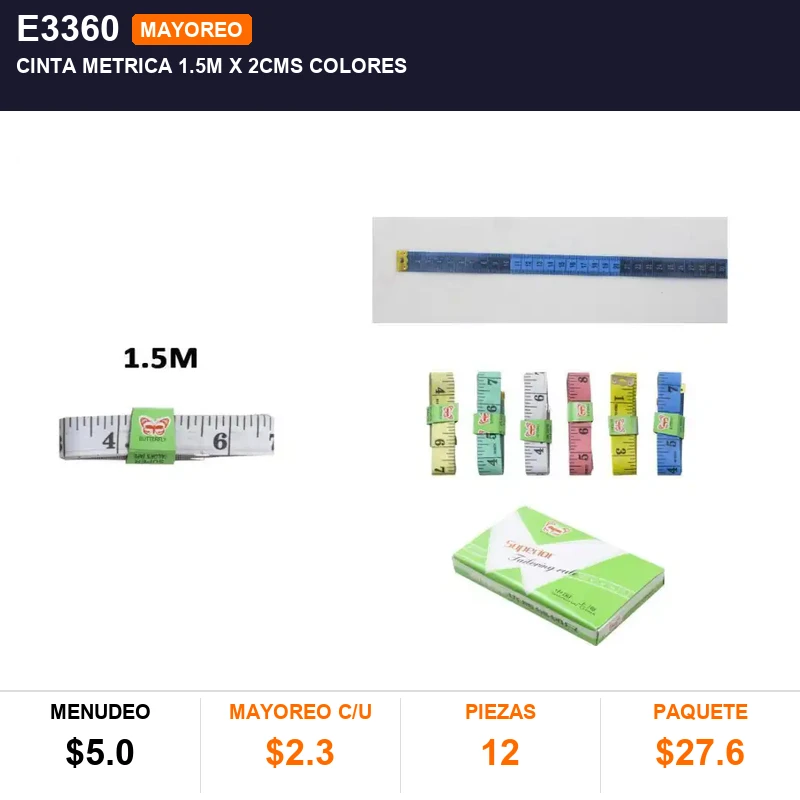 CINTA METRICA 1.5M x 2CMS COLORES , PQT C/12 PZAS , CAJA C/120 PQTS