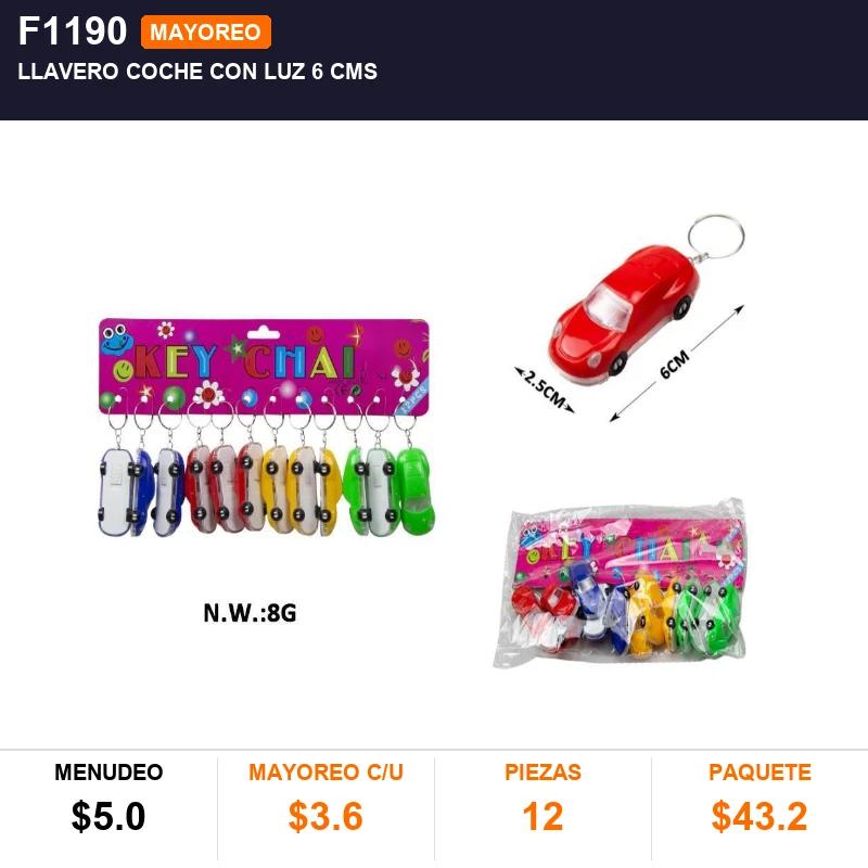 LLAVERO COCHE CON LUZ 6 CMS , PQT C/12 PZS, CAJA C/150 PQTS