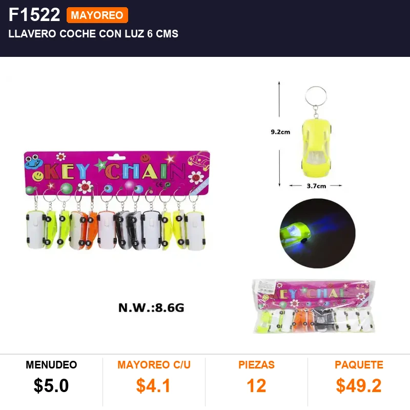 LLAVERO COCHE CON LUZ 6 CMS , PQT C/12 PZS, CAJA C/150 PQTS