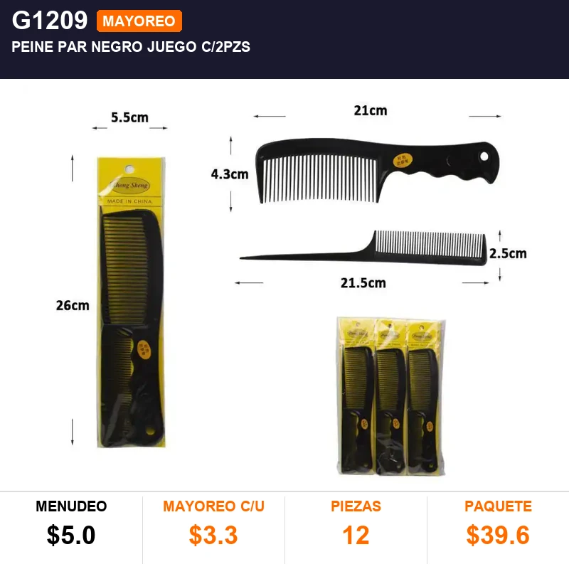 PEINE PAR NEGRO JUEGO C/2PZS, PQT C/12 JGOS , CAJA C/100 PQTS