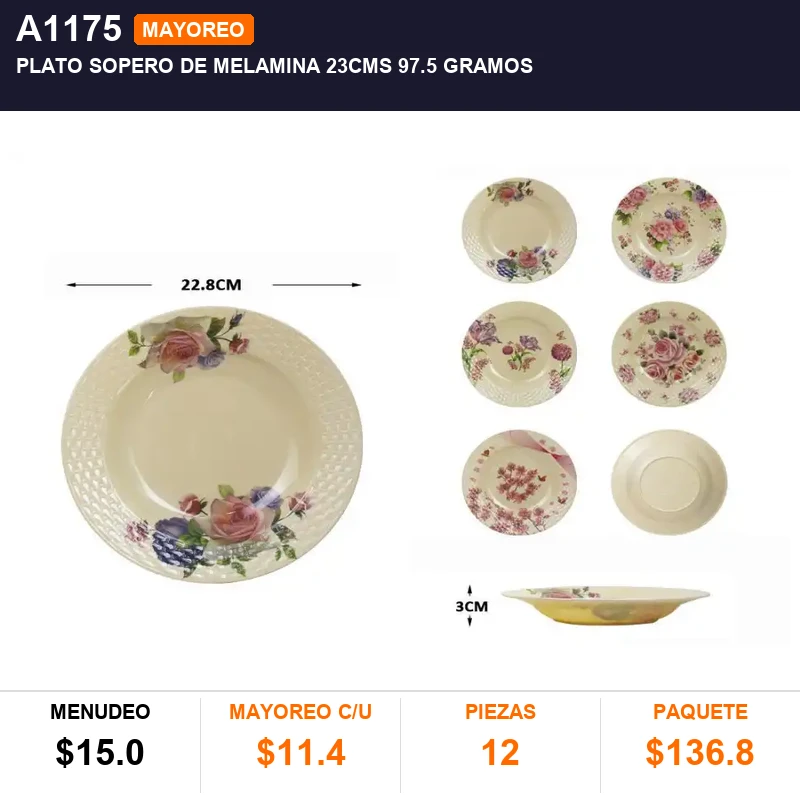 PLATO SOPERO DE MELAMINA 23CMS 97.5gramos ,CAJA C/240 PZS