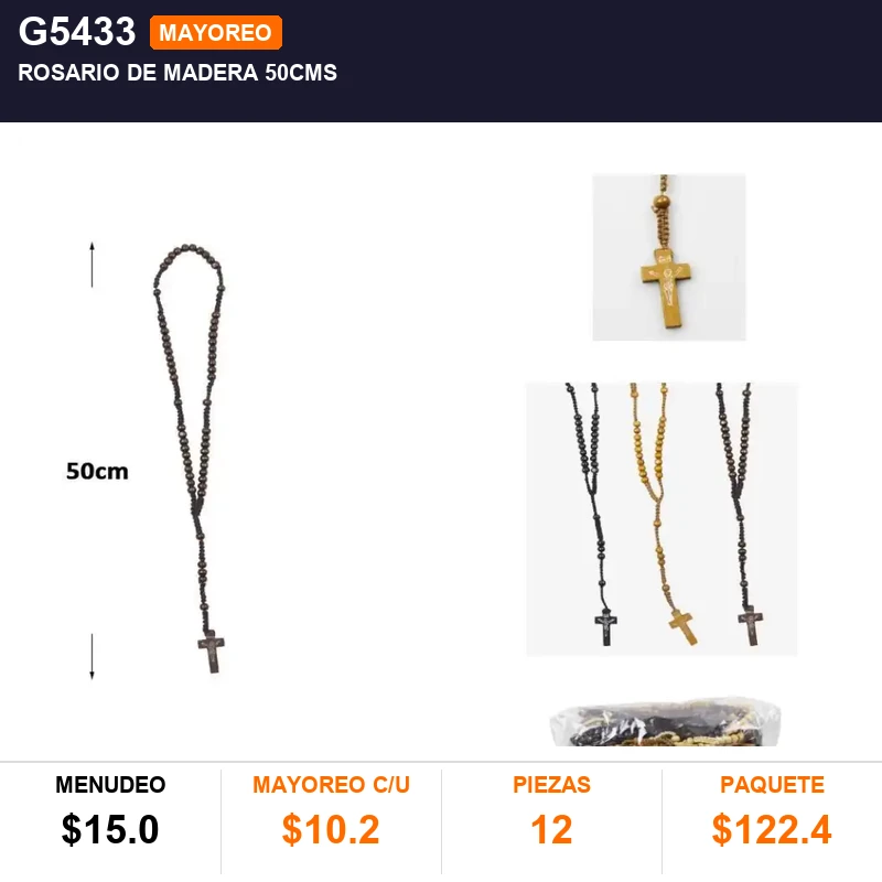 ROSARIO DE MADERA 50CMS , PQT C/12 PZAS , CAJA C/100 PQTS