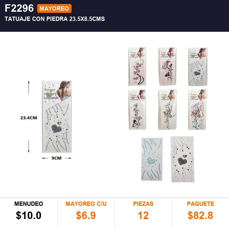 TATUAJE CON PIEDRA 23.5X8.5CMS , PQT C/12 PZAS ,CAJA C/100 PQTS