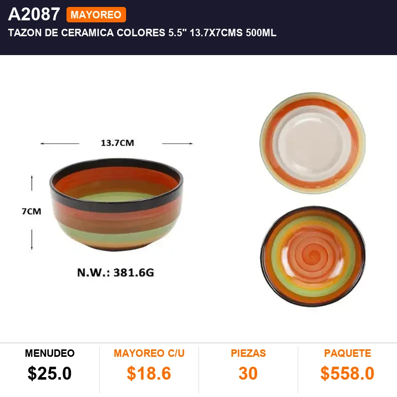 TAZON DE CERAMICA COLORES 5.5″ 13.7X7CMS 500ml, CAJA C/60 PZAS